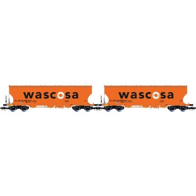 Das Arnold HN9774 Set bringt zwei moderne Getreidesilowagen im Design der Firma Wascosa auf Ihre TT-Anlage. Die vierachsigen Wagen mit runden Seitenwänden sind in leuchtendem Orange gehalten und tragen ein großflächiges „WASCOSA“-Logo – ein typisches Erscheinungsbild im europäischen Schienengüterverkehr der Epoche VI.