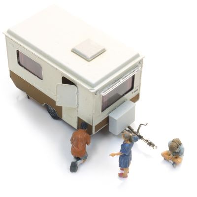 Der Artitec Wohnwagen 'Bastei' auf dem Campingplatz wird als vollständig montiertes Fertigmodell geliefert. Einfach aus der Verpackung nehmen und aufstellen – kein zusätzlicher Bauaufwand nötig. Dank kompakter Bauweise lässt sich die Szene problemlos auch auf kleineren Flächen unterbringen.