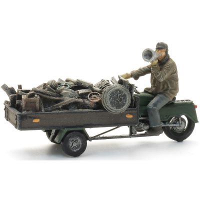 Das Modell zeigt ein funktionales Moped mit Ladefläche und Fahrer – ein vertrauter Anblick in städtischen Vierteln. Es eignet sich hervorragend zur Darstellung von Kurierdiensten, kleinen Lieferungen oder Handwerksszenen. Die detailreiche Gestaltung und die realistische Haltung der Figur sorgen für eine glaubwürdige Darstellung in Ihrer Modellwelt.