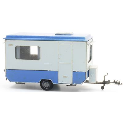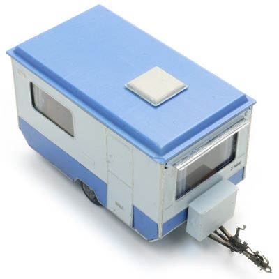 Mit seinen typischen Proportionen und klaren Konturen lässt sich der Wohnwagen 'Bastei' problemlos in verschiedene Szenen integrieren – sei es auf einem Campingplatz, an einer Landstraße oder im Vorgarten eines kleinen Wochenendhauses. Die Bemalung ist sauber ausgeführt, die Fensterflächen und Linien sind klar erkennbar und sorgen für ein stimmiges Gesamtbild.