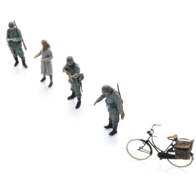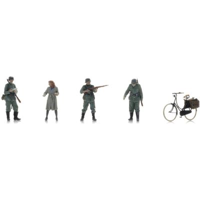 Das Set zeigt einen militärischen Kontrollpunkt mit einer zivilen Person auf dem Fahrrad. Solche Situationen waren an Straßensperren oder Kontrollstellen im Alltag präsent und bieten interessante Möglichkeiten für die Gestaltung realistischer Szenen.