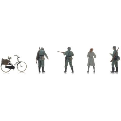 Kleine Szenen sind es, die eine Modellbahn erst wirklich lebendig machen. Ein Kontrollposten mit einer Zivilperson auf dem Fahrrad stellt eine typische Momentaufnahme dar, wie sie an Straßen oder Kontrollpunkten früher häufig vorkam. Dadurch entsteht eine besonders authentische Atmosphäre auf Ihrer Anlage oder in einem Diorama.