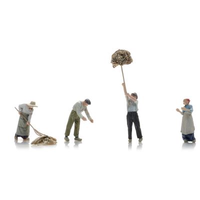 Das Artitec 5160061 N Figurenset „Heumacher“ stellt eine klassische Szene aus der landwirtschaftlichen Arbeit dar und eignet sich hervorragend zur Ausgestaltung ländlicher Anlagenbereiche. Die vier Figuren sind für die Spur N ausgelegt und zeigen Tätigkeiten rund um die Heuernte. Damit lässt sich der traditionelle Arbeitsalltag auf Feldern und Wiesen realistisch und lebendig auf der Modellbahnanlage oder in einem Diorama darstellen.