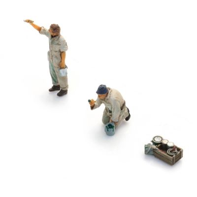 Die Figuren bestehen aus handbemaltem 3D-Druck und werden durch feine Ätzteile ergänzt. Diese Materialkombination ermöglicht eine sehr präzise Ausarbeitung von Körperhaltungen, Werkzeugen und Arbeitsgesten. Gerade im Maßstab N ist diese Detailtiefe entscheidend, um die dargestellte Tätigkeit eindeutig erkennbar umzusetzen.