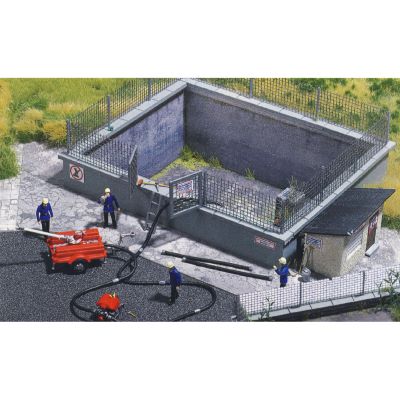 Bausatz für einen dörflichen Feuerlöschteich zur Wasserversorgung bei der Brandbekämpfung. Das Wasserbecken mit Überlauf und Wartungshäuschen kann wahlweise im gefüllten oder im entleerten Zustand aufgebaut werden und ist von einem Maschendrahtzaun mit Toren umgeben. Zusätzlich enthalten: Tragkraftspritze, Wasserwerfer, Schläuche mit Kupplungen, Eimer und Besen, Schilfpflanzen, Schwäne und Kleintiere. Mit vielseitigem Ausschneidebogen.