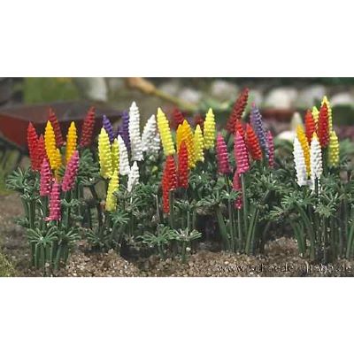 Bausatz für 16 Lupinenstauden mit jeweils mindestens 3 Blüten und 9 Blättern (einschließlich Grundplatten). Die Farben der Blüten entsprechen typischen Gartenlupinen in verschiedenen bunten Farben.