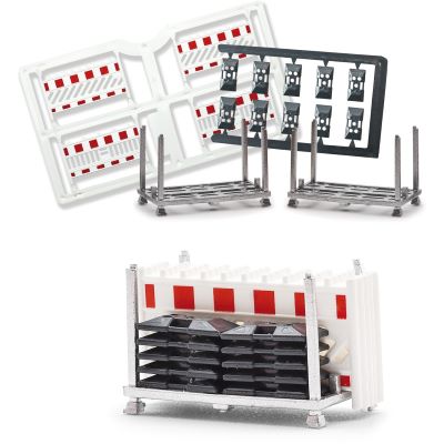 Im Zentrum des Sets stehen vier Transportgestelle, wie sie im echten Baustellenalltag zur Lagerung und zum einfachen Transport von Absperrzäunen genutzt werden. Die filigran nachgebildeten Gestelle sind bestückt mit insgesamt 20 Schrankenzäunen inklusive passender Fußplatten – perfekt für detailverliebte Modellbauer.