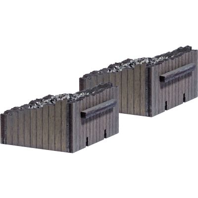 Im Busch 8839 Set enthalten sind zwei Prellböcke aus echtem Holz, inklusive fertig kolorierter Oberfläche und integriertem Schotterkasten mit Füllung. Die Bauteile sind montagefertig vorbereitet und lassen sich direkt auf der Anlage verwenden.