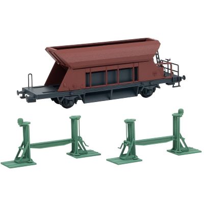 Zum Set gehört ein aufgebockter Güterwagen, der farblich auf die Szenerie abgestimmt ist. Der Wagen ist als reines Standmodell ohne Kupplungen ausgeführt und wurde so konzipiert, dass er perfekt in die Hebesituation integriert ist – ideal zur Darstellung von Reparaturen, Inspektionen oder Umbauten.