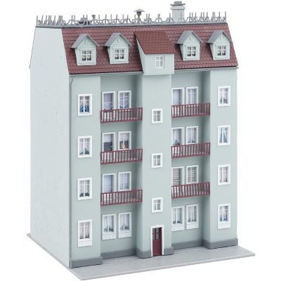 Das Wohnhaus überzeugt durch seine graue Fassadengestaltung, das dunkelrote Satteldach aus Ziegeln und die markanten sechs Balkone. Besonders auffällig ist der flache Dachbereich, der von umlaufenden schmiedeeisernen Zierelementen eingerahmt wird. Diese Details verleihen dem Modell nicht nur Authentizität, sondern auch ein Stück architektonische Eleganz.