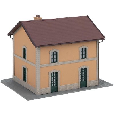Die detailreiche Gestaltung des Gebäudes mit sandsteinfarbener Fassade, Steinverzierungen und klassischen Proportionen sorgt für hohe Authentizität. Die flexibel einsetzbaren Schranken erlauben verschiedene Aufbauvarianten, wobei eine Schranke sogar direkt am Gebäude angebracht werden kann. Damit eignet sich das Modell ideal, um Übergangssituationen realistisch darzustellen.