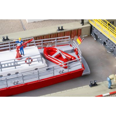 Das Modell überzeugt durch seine detailreiche Nachbildung: vom spitz zulaufenden Bug über das Steuerhaus bis zur offenen Ladefläche für Löschgeräte. Ein rotes Rettungsboot ist zusätzlich enthalten, um die Szene noch realistischer darzustellen. Mit der optionalen Innenbeleuchtung lässt sich das Boot auch für Abend- oder Nachtszenen eindrucksvoll in Szene setzen.