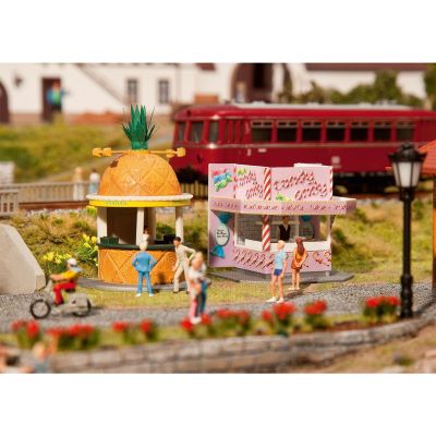 Beide Buden sind mit auffälligen Schildern, typischen Verkaufsfenstern und passender Bemalung gestaltet. Ob mit Figuren ergänzt oder alleinstehend platziert – sie fügen sich harmonisch in jede Szenerie ein und laden Besucher in Ihrer Modellwelt zum Naschen oder Erfrischen ein.
