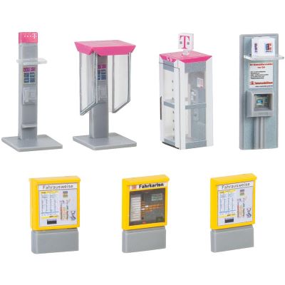 Dieses Ausschmückungs-Set besteht aus mehreren Fahrscheinautomaten und verschiedenen Telefonhäuschen und -hauben der Deutschen Telekom und ermöglicht Ihnen eine belebte Ausgestaltung Ihrer Modellwelt.