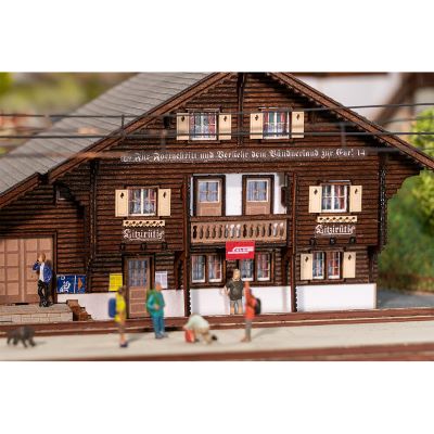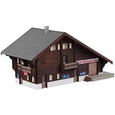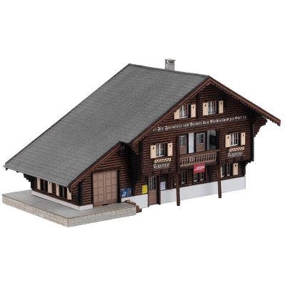 Der Bahnhof Litzirüti wurde 1914 eröffnet und liegt malerisch in der alpinen Landschaft der Schweiz. Das Modell greift diese besondere Atmosphäre gekonnt auf: Die dunkle Holzverkleidung und die hellen Fensterläden bilden einen markanten Kontrast und vermitteln authentisches alpines Flair. Das tief gezogene Dach mit grauer Ziegelstruktur verleiht dem Gebäude Charakter und fügt sich harmonisch in jede naturgetreue Modelllandschaft ein – ideal für Bahnfreunde mit Sinn für nostalgisches Design.