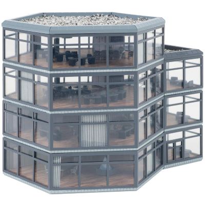 Mit dem Faller 222227 Bürohochhaus holen Sie moderne Architektur in Ihre N-Modellstadt. Dieser markante, vierstöckige Bürokomplex besticht durch seine futuristische sechseckige Grundform, vollverglaste Fassaden und ein dreistöckiges, angebautes Treppenhaus. Die offen wirkende Bauweise verleiht der Szene Leichtigkeit und urbanes Flair – ideal für alle, die Wert auf zeitgemäße Stadtgestaltung legen.