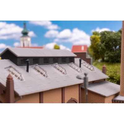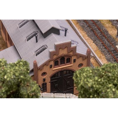 Mit einer Höhe von 160 mm ist die Lokwerkstatt ein markantes Gebäude im Maßstab N. Sie setzt vertikale Akzente in Ihrer Modelllandschaft und sorgt für Abwechslung zwischen niedrigeren Gebäuden.
