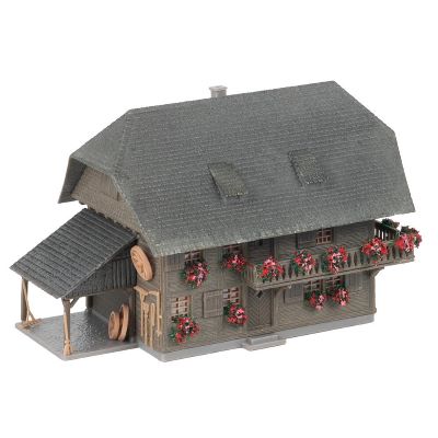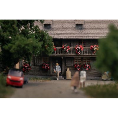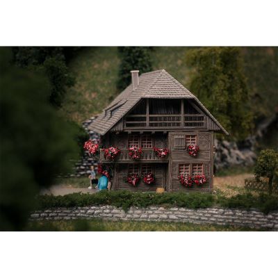 Das dunkle Holzhaus zeigt sich im traditionellen Stil mit geneigtem Dach und typischer Schwarzwald-Optik. Die patinierte Ausführung verleiht dem Gebäude ein realistisches, gealtertes Aussehen und sorgt für eine naturgetreue Einbettung in Ihre Modellwelt.