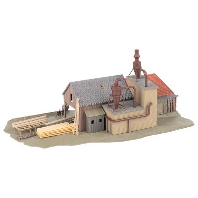 Mit einer Größe von 220 x 130 x 90 mm ist das Sägewerk großzügig dimensioniert und eignet sich optimal für größere Szenen innerhalb der Spur N. Das Gebäude bietet genügend Fläche für kreative Arrangements – etwa in Verbindung mit Holzlagerplätzen, Waldszenen oder weiteren Handwerksbetrieben.