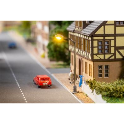 Die Peitschenlampen sind ein typisches Detail moderner Stadt- und Straßenszenen. Ob auf belebten Straßen, in Industriegebieten oder auf Bahngeländen – diese Lampen setzen Akzente und verleihen der Anlage einen authentischen Charakter. Durch ihre kompakte Höhe von 30 mm passen sie ideal zur Maßstäblichkeit der Spur Z und wirken zugleich filigran und realistisch.