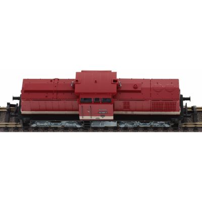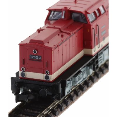 Die Diesellokomotive 112 303-3 wurde in der Epoche IV der Deutschen Reichsbahn eingesetzt und steht für die technologische Weiterentwicklung in der DDR. Mit ihrer bordeauxroten Farbgebung gehört sie zu den Lokomotiven, die zwischen 1972 und 1990 umgebaut wurden, um mit einem stärkeren Dieselmotor ausgestattet zu werden. Fleischmann hat dieses Vorbild bis ins kleinste Detail im Modell umgesetzt, um eine möglichst realistische Nachbildung zu gewährleisten.