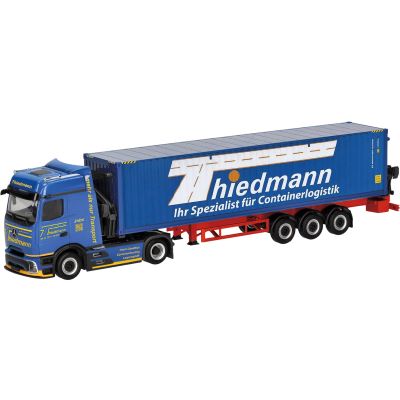 Als Container-Seitenlader-Modell bietet der Herpa 319782 eine außergewöhnliche Kombination aus moderner Zugmaschine und speziellem Auflieger zur seitlichen Be- und Entladung von Containern. Diese Variante ist im realen Güterverkehr besonders dort gefragt, wo kein Portalkran oder Gabelstapler zur Verfügung steht. Das Modell zeigt diese Logistiklösung in beeindruckender Detailtreue – mit typischen seitlichen Greifarmen und Containeraufnahme. Die Actros L-Zugmaschine ist als moderne 2-Achs-Version umgesetzt und mit einer hochdetaillierten Bigspace-Fahrerkabine versehen. Alle Komponenten sind im Maßstab 1:87 ideal abgestimmt und geben ein stimmiges Gesamtbild ab.