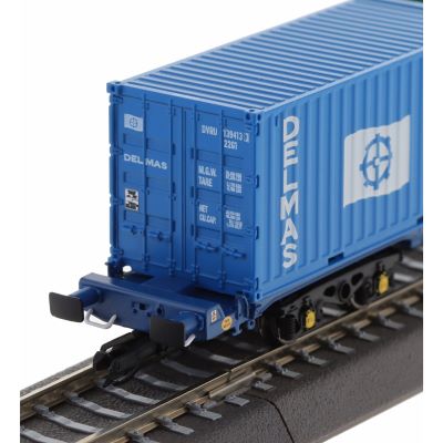Das Modell besticht durch ein hohes Maß an Detaillierung: Vom Wagenrahmen über die Puffer bis hin zu den Aufnahmepunkten für die Container ist alles exakt im Maßstab TT (1:120) nachgebildet. Die drei 20'-Container sind einzeln gestaltet und zeigen unterschiedliche Designs, was für visuelle Abwechslung und Realismus im Zugverband sorgt.