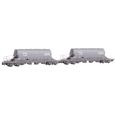 Die beiden vierachsigen Schwenkdachwagen tragen die Aufschrift „DMI / Saint Gobain“ und fallen durch ihre schlichte, graue Farbgebung auf. Diese sorgt für ein realistisches Erscheinungsbild im Güterzug und unterstreicht die industrielle Nutzung der Wagen – ideal für Schüttguttransporte unter Schutz vor Witterung.
