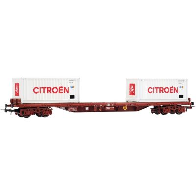 Der vierachsige Flachwagen Typ Rs war in den 1970er Jahren ein häufig eingesetzter Wagentyp im internationalen Containerverkehr. Die SNCF verwendete ihn unter anderem für den Transport von Industrieprodukten großer Marken – wie in diesem Fall der bekannten französischen Automarke Citroën. Die beiden weißen Container mit Citroën-Beschriftung verleihen dem Modell einen unverwechselbaren Look und wecken Erinnerungen an die Blütezeit des französischen Automobilbaus.