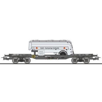 Der Spezialtransportwagen mit einer LüP von 152 mm bildet die ideale Plattform für den Strüver Tankauflieger. Die ELAN-Beschriftung ist gestochen scharf aufgebracht, das Fahrgestell des Wagens ist fein detailliert. Die Kombination aus Bahnwagen und Tankauflieger erzeugt ein authentisches Bild eines Transports, wie er in den 1960er- bis 1980er-Jahren auf Bahnhöfen und bei Mineralölgesellschaften alltäglich war.
