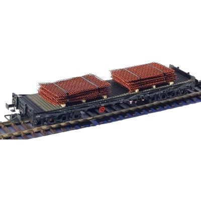 Die Baustahlmatten sind sorgfältig gebündelt, auf Transporthölzern gelagert und mit Spannbändern gesichert, um ein authentisches Erscheinungsbild zu gewährleisten. Mit einer Länge von ca. 2 x 45 mm passt dieses Ladegut perfekt auf alle gängigen 2-achsigen Flach-, Niederbord- und Rungenwagen im H0-Maßstab. Die präzise Verarbeitung und die realistische Darstellung machen es zu einem Highlight auf Ihrer Modellbahnanlage.