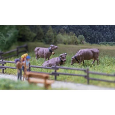 Die handkolorierten Kühe aus Kunststoff sind in natürlichen Posen dargestellt und passen perfekt in bergige Landschaften, auf Almen, am Waldrand oder entlang von Feldwegen. Die hochwertige Bemalung und stimmige Gestaltung sorgen für eine harmonische Gesamtwirkung in Ihrer H0-Landschaft.