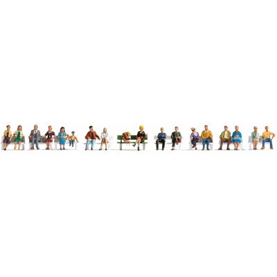 Das Set enthält eine bunte Mischung an sitzenden Figuren: Eltern mit Kindern, Geschäftsleute beim Warten oder Gespräch sowie Spaziergänger, die entspannt die Aussicht genießen. Die 18 Figuren sind handkoloriert und überzeugen durch ihre realitätsnahe Gestaltung – perfekt für authentische Alltagsszenen auf der Modellanlage.