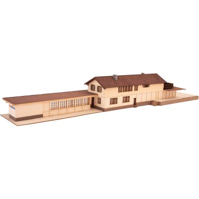 Im Lieferumfang sind neben einer ausführlichen, bebilderten Anleitung auch der passende Laser-Cut Spezial-Kleber enthalten. Damit gelingt der Aufbau des Gebäudes präzise und stabil. Mit seinen Maßen von 33,7 × 7 cm und einer Höhe von 5 cm eignet sich das Modell perfekt als zentraler Blickfang in einer Spur N Alpenlandschaft.