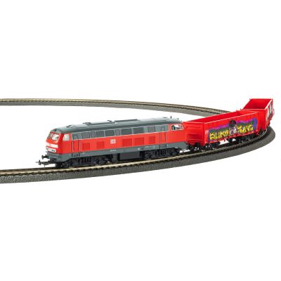 Mit dem Piko 57032 H0 Start-Set „kids Güterzug“ gelingt der Einstieg in die faszinierende Welt der Modelleisenbahn auf besonders spielerische Weise. Im Mittelpunkt steht eine kräftige Diesellok der Baureihe 218 der Deutschen Bahn AG – begleitet von zwei offenen Güterwagen des Typs Eaos, die mit farbenfrohen Graffiti versehen sind. Das Besondere: Die auffälligen Designs leuchten im Dunkeln dank Glow-in-the-Dark-Effekt – ein echtes Highlight für junge Eisenbahnfans ab 8 Jahren.