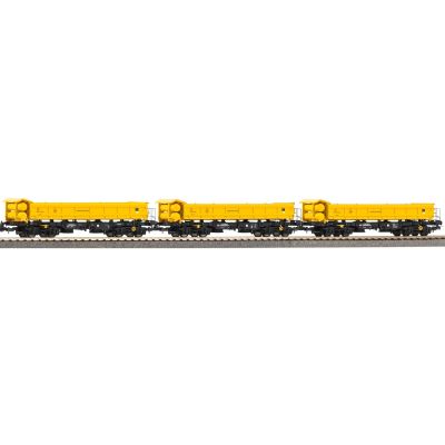 Die Diesellok DE 18 präsentiert sich im typischen **gelben Leonhard-Weiss-Farbschema** mit feinster Bedruckung und realistischen Gravuren. Sie besticht durch eine filigrane Nachbildung von Lüftern, Dachaufbauten und Griffstangen. Die drei **Fakks 127 Zweiseitenkipper** sind ebenso detailliert ausgeführt und zeichnen sich durch präzise Nachbildung der Schüttgutmulden und Betriebsnummern aus. Zusammen ergibt sich ein realitätsnahes Baustellenzug-Set mit hohem Wiedererkennungswert.
