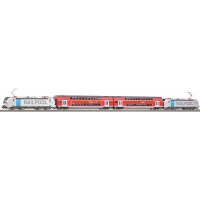 In enger Anlehnung an das Vorbild offeriert PIKO ein thematisch passendes Zugset mit zwei angetriebenen Lokomotiven mit unterschiedlichen Betriebsnummern. Vorbildgetreu sind beide Vectron-Maschinen in Railpool-Bedruckung gestaltet. Die Türen beider Loks sind mit Reklame für PIKO versehen.Zusätzlich enthalten sind ein Doppelstock-Personenwagen der 1./2. sowie ein Wagen der 2. Klasse. Technische Highlights sind der fahrtrichtungsabhängige weiß/rote LED-Lichtwechsel, die Stromabnehmer aus Metall, profilierte Radsätze, vorbereitete Soundnachrüstung, das aufwendig bedruckte Gehäuse, der kräftige Motor mit Schwungmasse und Kupplungsschächte nach NEM 362 an allen Fahrzeugen. Die Wechselstromversion verfügt jeweils über einen werkseitig eingebauten mfx-fähigen Decoder.