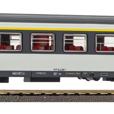 Der durch die Fenster sichtbare Fahrgastraum ist typisch für die 1. Klasse ausgeführt: geräumige Sitzanordnung, ruhige Farbgestaltung und großzügige Fensterflächen vermitteln auch im Modell ein Gefühl von Komfort. Die feine Bedruckung und die authentische Wagennummerierung runden das äußere Erscheinungsbild stimmig ab und machen den Wagen zu einem Blickfang in jeder Corail-Komposition.