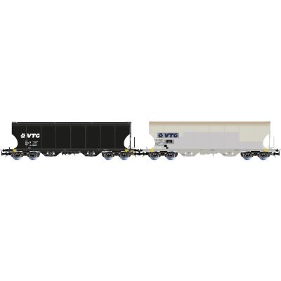 Diese Silowagen kommen in Ganzzügen oder gemischten Güterzügen europaweit zum Einsatz und sind speziell für den Transport von Getreide und anderen rieselfähigen Gütern konzipiert. Die Farbgestaltung in Schwarz und Grau spiegelt die moderne Logistikoptik wider, wie sie bei der VTG im täglichen Betrieb zu sehen ist.
