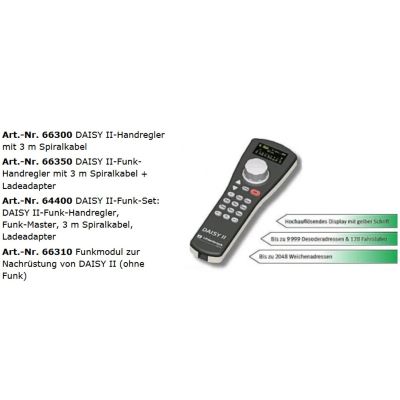 Der DAISY II Funk-Handregler bietet denselben Funktionsumfang wie der kabelgebundene DAISY II-LocoNet-Handregler. Durch die Verwendung der Frequenz 868 MHz ist eine stabile und zuverlässige Verbindung garantiert. Darüber hinaus lässt sich der Handregler auch mit Spezialanwendungen wie dem Faller Car-System Digital oder dem GamesOnTrack-System kombinieren.