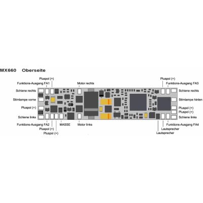 Der MX660 ist ein einseitig bestückter „Flachdecoder“, der mit einer Länge von nur 120 mm besonders platzsparend ist. Mit den 9 Anschlussleitungen für Schiene, Motor und 4 Funktionsausgänge bietet dieser Decoder alles, was für die Steuerung und den Soundbetrieb eines Fahrzeugs erforderlich ist. Die geringen Maße von 25 x 11 x 2 mm ermöglichen den Einbau auch in Modelle mit begrenztem Innenraum.