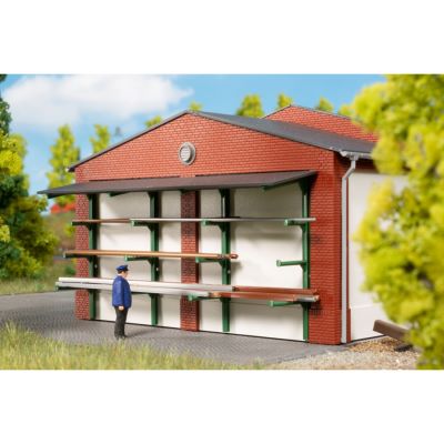 The work and recreation rooms for the track foreman, track runners and track workers are located in the track maintenance building. Materials and tools for the daily maintenance work on a particular section of track are stored here. The model consists of offices and a garage. Small vehicles can be stored under the canopy at the rear. New masts for signal boards, for example, are stored in the pole store. Vehicles can be loaded onto flat wagons via a head ramp built from old sleepers.
