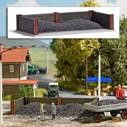 The coal store consists of a base plate with perfectly reproduced and rusted T-beams, into the profiles of which the 24 block planks made of real wood can be inserted loosely as walls in accordance with the prototype. Suitable for scenes e.g. in a railroad depot, in a port or in a fuel store.