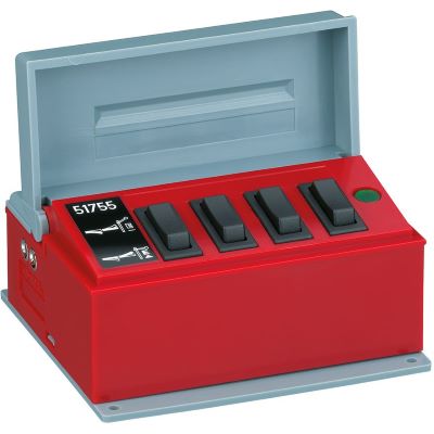 You can use the control panel to set up to 4 LGB points, signals, uncoupling tracks or other accessories. Each momentary rocker switch operates one accessory item. The control panel is connected to an alternating current source (18 V) via the connections on the rear. When using a switching power supply (L51090 or L51985), the converter 60130 is also required. An LED indicates whether the control panel is supplied with power. Color-coded connections on the back make connection easier. With stickers for labeling the switch assignment.