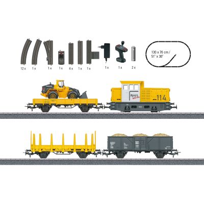 Prototype: Henschel DHG 300 B type industrial diesel locomotive. A loaded low side car, an open boxcar, and a stake car in a construction train design.Model: The locomotive has an mfx digital decoder. 1 axle powered. Traction tires. The triple headlights change over with the direction of travel, will work in conventional operation, and can be controlled digitally. A sturdy wheel loader and a set of barriers and signs are included in the package for loading the freight cars. All of the cars have Relex couplers. Length of the train approx. 45.3 cm. Contents: 12 curved track 24130, 4 straight track 24172, 1 straight track 24188, 1 base station, 1 curved track 24224, 1 left turnout 24611, and a bumper 24977. Switched power supply and a wireless, handy infrared control unit, the Märklin Power Control Stick. 2x AAA batteries included. Expansion possibilities with the C Track extension sets and the entire C Track program. The turnouts can be retrofitted with the 74492 electric drive.Highlights Four-car freight train in an attractive construction train design. Sturdy locomotive with mfx digital decodr and triple headlights. Wide range of play options on the theme of construction sites. Ergonomic power control stick for controlling up to 4 locomotives and 5 functions. Free movement around the layout thanks to the wireless infrared control unit. Easy to set up C-track layout. Includes barriers, signs and wheel loader for playing and loading.