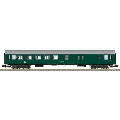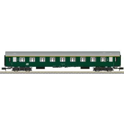 The Minitrix 18251 Express Train Car Set is a perfect reproduction of two classic Czech Rail road (České dráhy, ČD) passenger cars from Era V. These coaches, type Y/B, are designed for long-distance service and represent the comfort offered by Czech trains in the 1990s. With a length over buffers (LüP) of 306 mm and the typical moss green color scheme, the cars fit perfectly into any N-gauge layout that recreates international express train service.