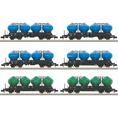The set consists of three Uacs wagons with a straight solebar and three wagons with a side "apron" - typical of different versions of this type of silo wagon. In addition, the color scheme with four blue and two green containers ensures a varied appearance in the train formation and reflects the diversity in real freight transport.