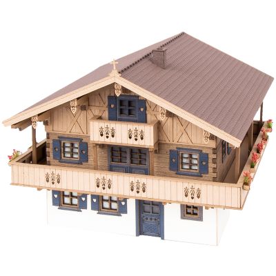 The laser-cut kit contains a comprehensive decoration sheet with various national flags and names for the boarding house. The beautiful woodwork on the gables, the colorful shutters and the balconies with flower boxes are a visual highlight. balconies with the flower boxes. The scope of delivery also includes the special laser-cut adhesive, an advertising sign, a flagpole and detailed building instructions.