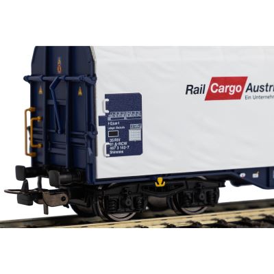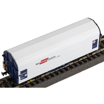 Printed version of the sliding tarpaulin wagon in the Rail Cargo Austria design in Era VI. The model impresses with its realistic reproduction of the tarpaulins, sharply contoured printing and excellent rolling characteristics.