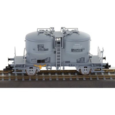 The DR cement silo car in Era IV with patches. The PIKO TT model of the cement silo car is a prototypical reproduction of the Ucsv dust car. It features all of the equipment and fittings as used in the prototype for filling or unloading the silo cars by compressed air. The toggle closures of the silo container openings, which are necessary for safe transport, are also exactly represented. The cars can be used prototypically in block trains as well as in attractive mixed freight trains.